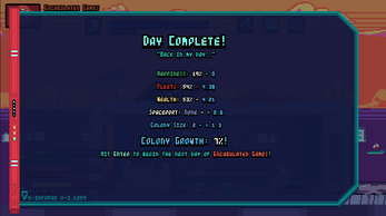 After the jam we will be adding the rest of Dan's narrative work (only 1/2 of the encounters you can run into are present ingame!), the rest of the characters on the roster, the background details we couldn't get to and fixing up any bugs. The max colony size you can hit is 7! Good luck!